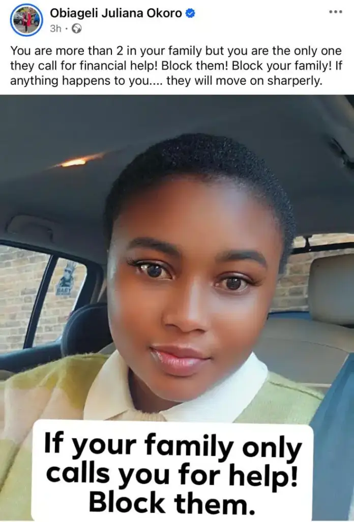 Obiageli Juliana Okoro, a UK-based Nigerian woman, has sparked buzz after sharing a blunt advice for people whose relatives only reach out when they need money.