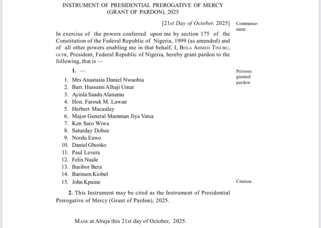 The announcement was made after Tinubu signed the Instrument of Clemency and Pardons, as revealed by his Special Adviser on Information and Strategy, Bayo Onanuga.