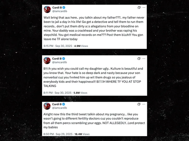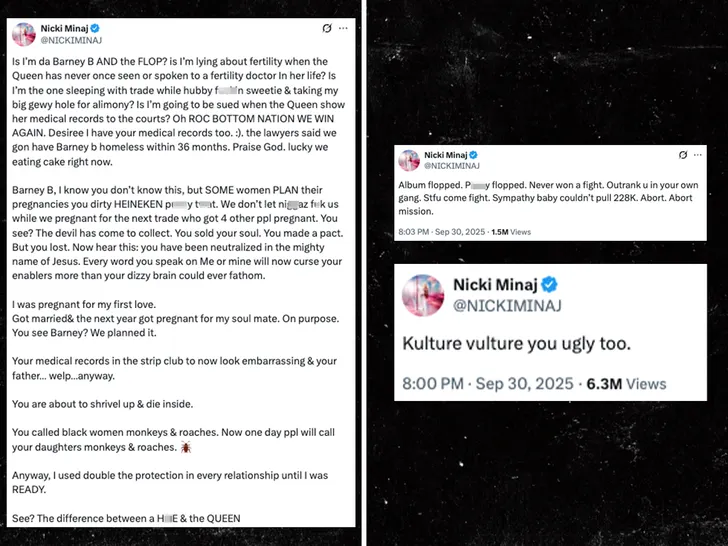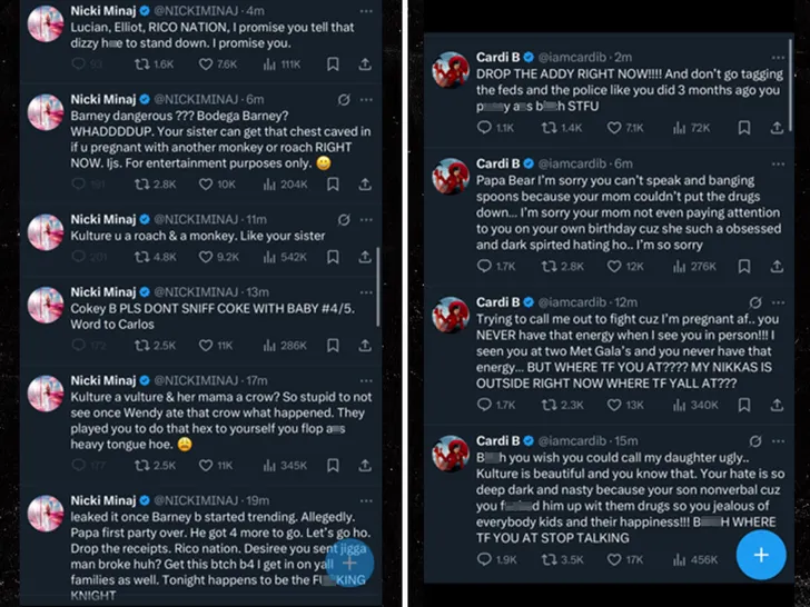 The drama hit a boiling point on Tuesday, when Nicki reiterated her “Barney B” nickname for Cardi … and came up with one for her daughter, labeling her “kulture vulture? Not long after, she spoke directly to Cardi’s oldest kid, writing … “Kulture vulture you ugly too.”