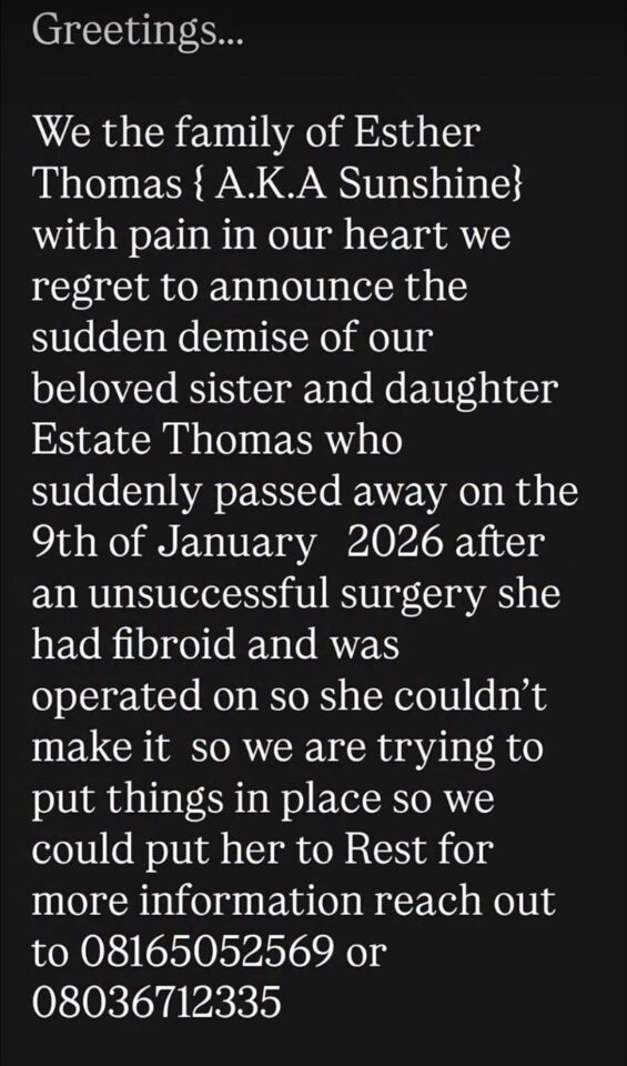 “We the family of Esther Thomas (A.K.A Sunshine) with pain in our heart we regret to announce the sudden demise of our beloved sister and daughter Esther Thomas who suddenly passed away on the 9th of January 2026 after an unsuccessful surgery,” the post reads.