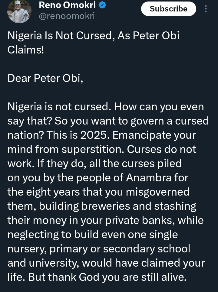 In his lengthy reply on X, Omokri wrote: “Nigeria Is Not Cursed, As Peter Obi Claims! Dear Peter Obi, Nigeria is not cursed. How can you even say that? So you want to govern a cursed nation? This is 2025. Emancipate your mind from superstition.”