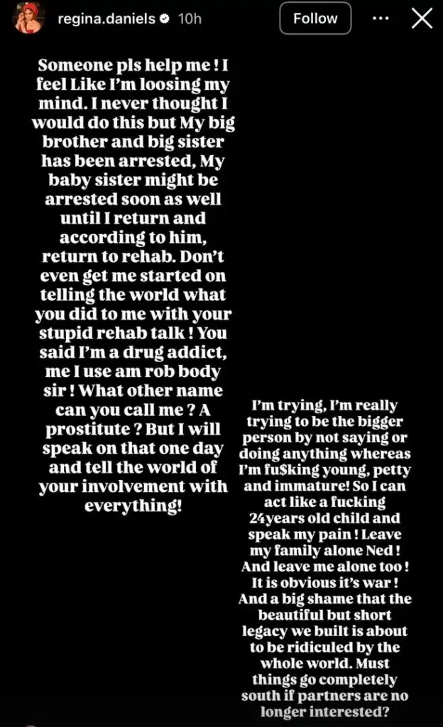 Popular Nollywood actress, Regina Daniels, has taken to social media in tears, accusing her husband, Senator Ned Nwoko of ordering the arrest of her elder brother and sister amid their escalating marital dispute.