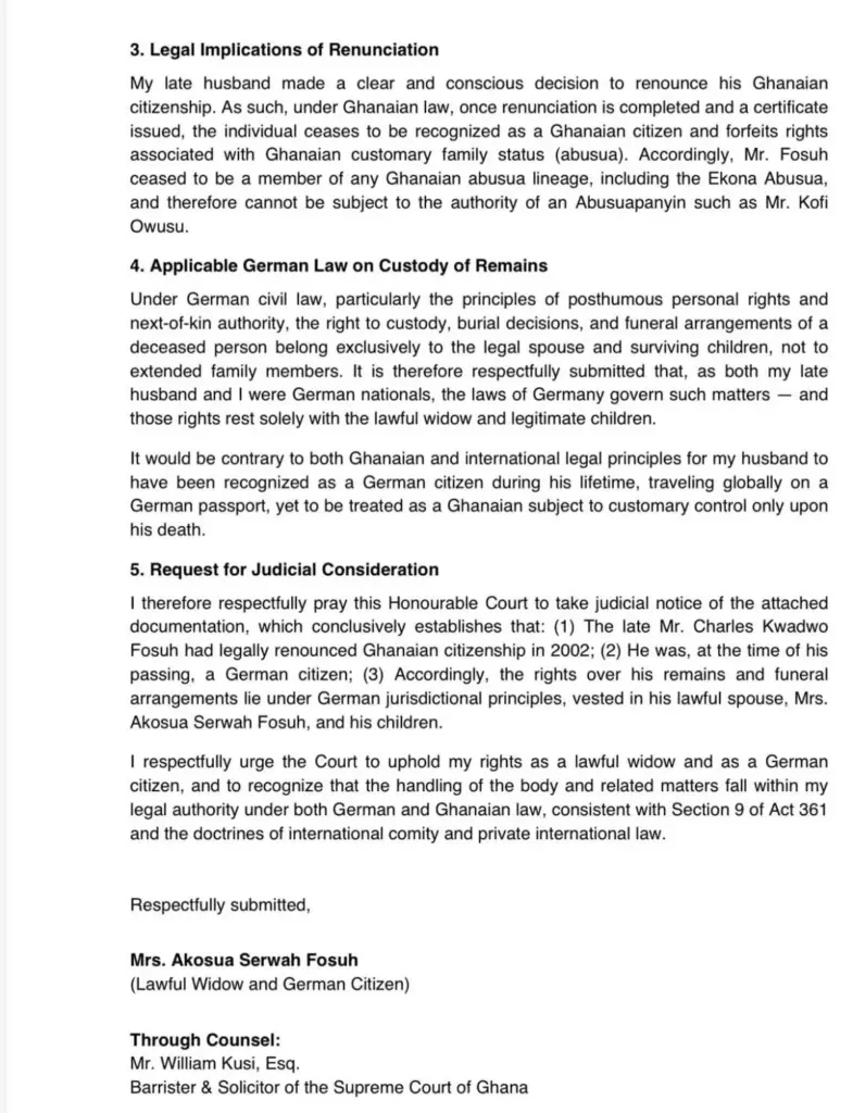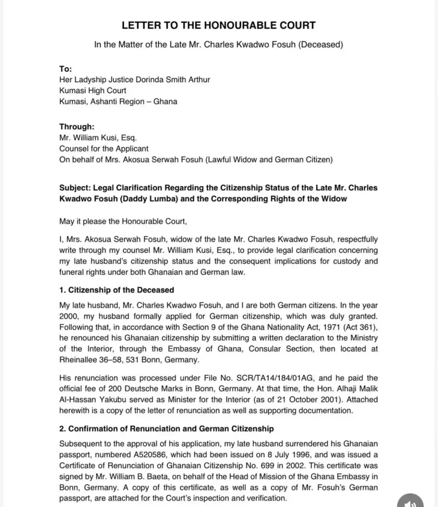 In the new letter that has begun to fly across social media platforms, Akosua Serwaa disclosed that ““I respectfully write through my counsel to provide legal clarification concerning my late husband’s citizenship status and the consequent implications for custody and funeral rights under both Ghanaian and German law”, adding that ““In the year 2000, my husband formally applied for German citizenship, which was duly granted”.